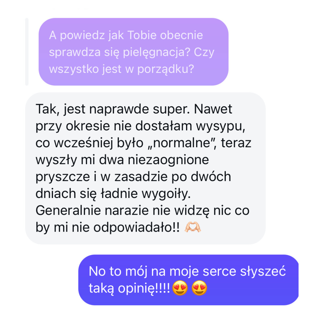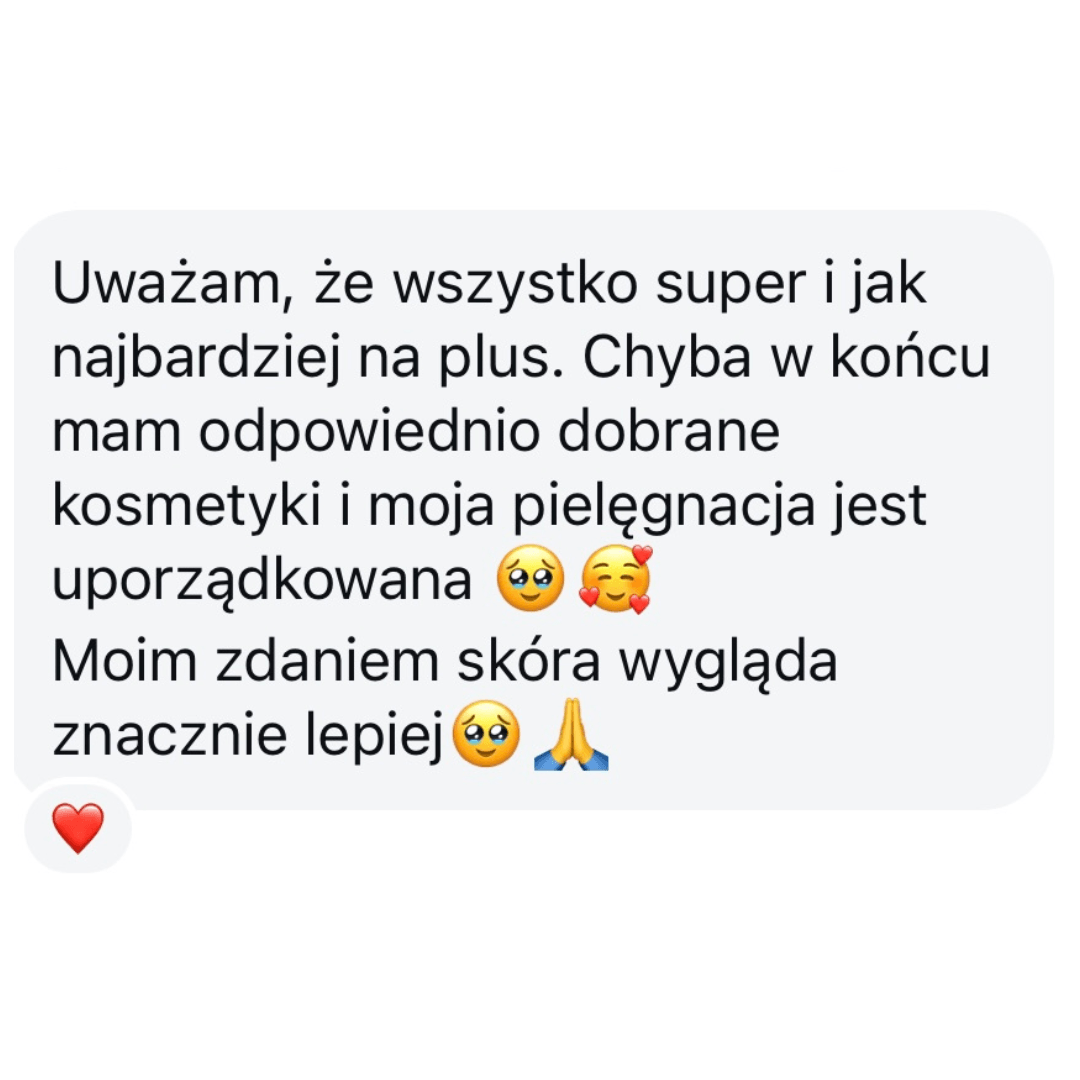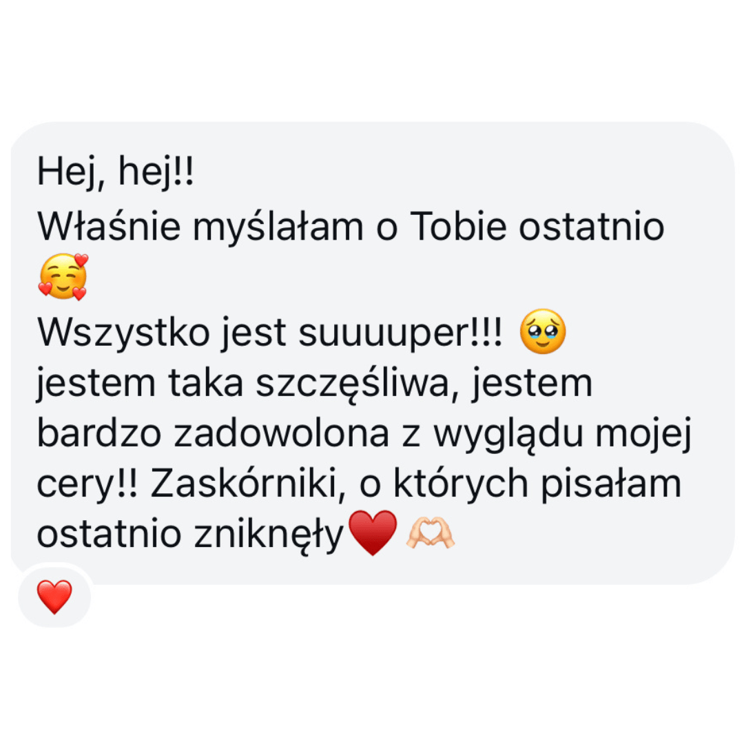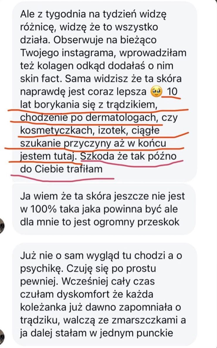 Czuwam nad Tobą i razem śledzimy postępy skóry. Zawsze możesz dopytywać o wszystko. Pozostaję dla Ciebie.